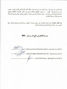 وقد اتَّفقت الأطراف على العمل المُشترك عبر جبهة عريضة لتطوير رؤية لمشروع وطني لإنجاز مهام التغيير وبناء دولة المواطنة المُتساوية والتنمية العادلة.