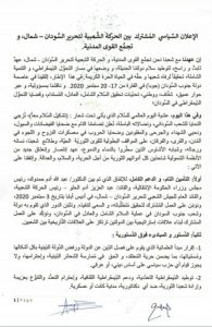 إن عهدنا مع شعبنا نحن تجمُّع القوى من المدنية، و الحركة الشعبية لتحرير السُّودان – شمال، عهدٌ ثابتٌ و راسخ، لتوطيد سلام دولتنا الحديثة، و وضعها في مسار التحوُّل الدِّيمقراطي، و التنمية الشاملة، تحقيقاً لرفاه شعبها و حقَّه في الحياة الحرة الكريمة. في هذا الإطار، إلتقينا في عاصمة دولة جنوب السُّودان (جوبا) في الفترة من 17- 20 سبتمبر 2020. و ناقشنا بمسؤولية، و عبر حوار عميق، شفَّاف، ووطني، تحدِّيات تحقيق السَّلام الشامل، العادل، المُستدام، وقضايا التحوُّل الدِّيمقراطي في السُّودان؛