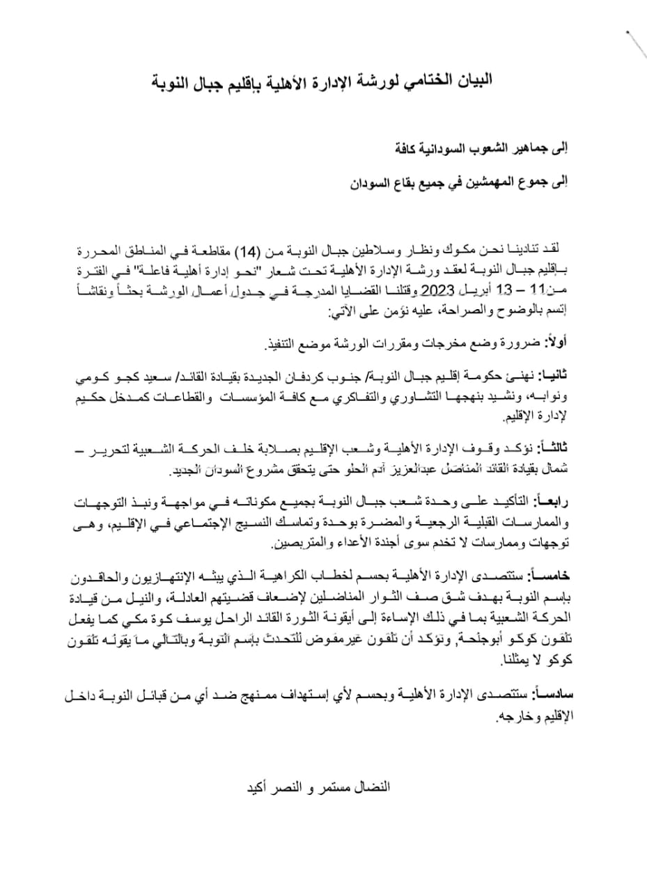 لقد تنادينا نحن مكوك ونظار وسلاطين جبال النوبة من (14) مقاطعة في المناطق المحررة بإقليم جبال النوبة لعقد ورشة الإدارة الأهلية تحت شعار “نحو إدارة أهلية فاعلة” في الفترة من11 – 13 أبريل 2023 وقتلنا القضايا المدرجة في جدول أعمال الورشة بحثاً ونقاشاً إتسم بالوضوح والصراحة، عليه نؤَمن على الآتي: