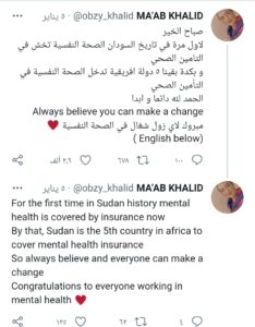 لم تتفاجأ الطبيبة السودانية، مآب خالد، بحصول تغريدة لها على تويتر على نحو ثلاثة آلاف نقرة إعجاب عند إعلانها خبرا يقول: ‘لأول مرة في تاريخ السودان ستصبح الصحة النفسية متضمنة في التأمين الصحي ‘.