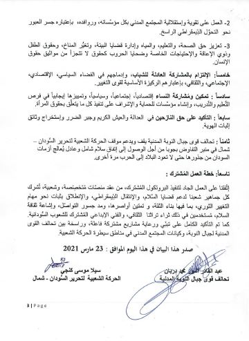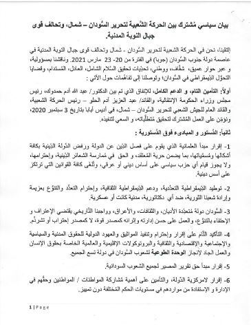 إلتقينا، نحن في الحركة الشعبية لتحرير السُّودان – شمال وتحالف قوى جبال النوبة المدنية في عاصمة دولة جنوب السُّودان (جوبا) في الفترة من 20- 23 مارس 2021. وناقشنا بمسؤولية، و عبر حوار عميق، شفَّاف، ووطني، تحدِّيات تحقيق السَّلام الشامل، العادل، المُستدام، وقضايا التحوُّل الدِّيمقراطي في السُّودان؛ وتوصلنا إلى تفاهُمات حول الآتي :