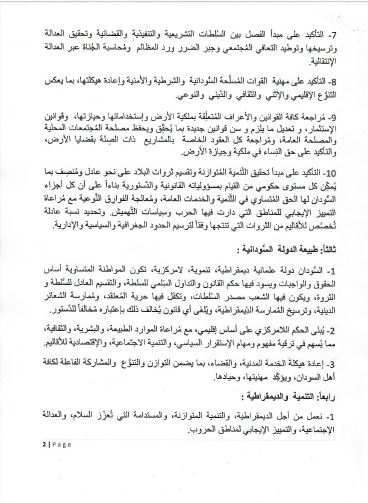 1- السُّودان دولة علمانية ديمقراطية، تنموية، لامركزية، تكون المواطنة المتساوية أساس الحقوق والواجبات ويسود فيها حكم القانون والتداول السِّلمي للسلطة، والتقسيم العادل للسُّلطة و الثروة، ويكون فيها الشعب مصدر السُلطات، وتكفَل فيها حرية المُعتقد، ومُمارسة الشعائر الدينية، وترسيخ المُمارسة الدِّيمقراطية، ويُلغَى أي قانون يُخالف ذلك بإعتباره مُخالفاً للدَّستور.