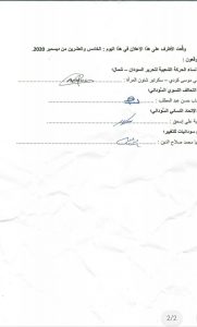 إجتمعنا نحن : (نساء الحركة الشعبية لتحرير السُّودان – شمال / التحالف النسوي السُّوداني / الإتحاد النسائي السُّوداني / سودانيات للتغيير) – في جوبا – جنوب السُّودان في الفترة من : (23 – 25 ديسمبر 2020) -وبعد حوار عميق حول كافة قضايا النساء وقضايا المرأة السُّودانية على وجه الخصوص – إتَّفقنا على الآتي: