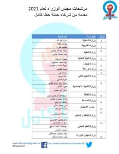 أعلن شركاء حملة حقنا كامل ترشيح 36 إمرأة لمجلس الوزراء بهدف ضمان مشاركة المرأة بما لايقل عن 40% وفقاً للوثيقة الدستورية .