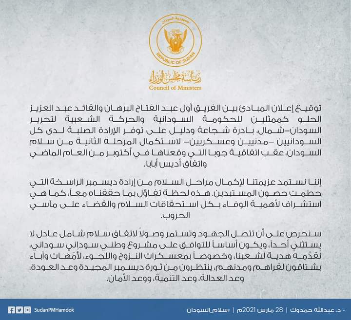 دحمدوك: توقيع إعلان المبادئ بادرة شجاعة ودليل على توفر الإرادة الصلبة لدى كل السودانيين -مدنيين وعسكريين بواسطة Aamer Tutu آخر تحديث مارس 28, 2021 شارك FacebookTwitter تويتر : Splmn.net