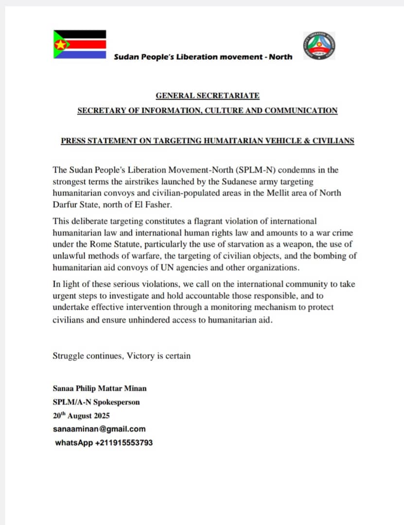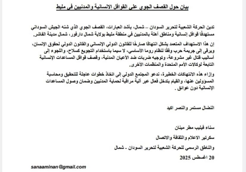 وقالت الحركة الشعبية في بيان اصدرته بتاريخ 20 اغسطس الجاري ، ” تدين الحركة الشعبية لتحرير السودان – شمال، بأشد العبارات، القصف الجوي الذي شنه الجيش السوداني مستهدفًا قوافل إنسانية ومناطق آهلة بالمدنيين في منطقة مليط بولاية شمال دارفور، شمال مدينة الفاشر ”