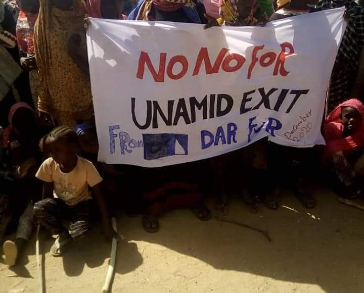 وحمل النازحون المعتصمون لافتات تطالب ببقاء بعثة اليوناميد وعدم خروجها من البلاد ،